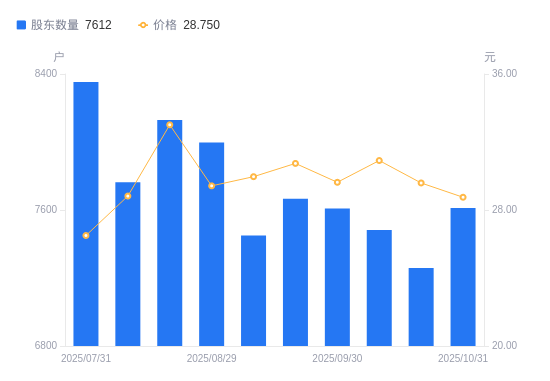 11月3日音书,数据显示,截至2025年10月31日远传水表,山科智能A股股东总户数为7612户,较上期(2025年10月20日)填补353户,增幅4.86%。公司最新A股总股本为1.4亿股,此中畅通A股8741.99万股,户均持有畅通A股数目为1.15万股,较上期省略558.48股,降幅4.64%;户均持畅通A股市值33.02万元,较上期省略2.62万元,降幅7.34%。